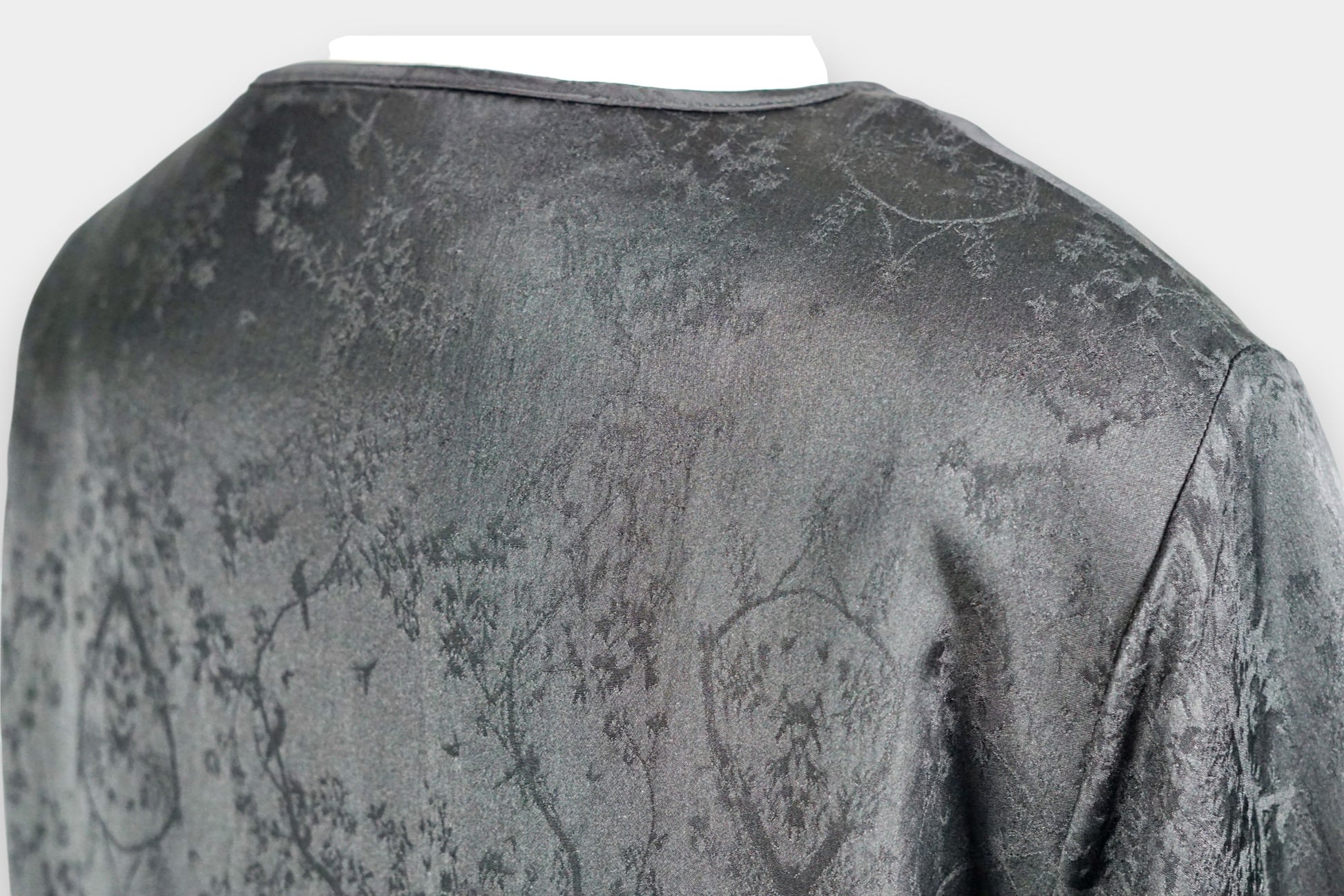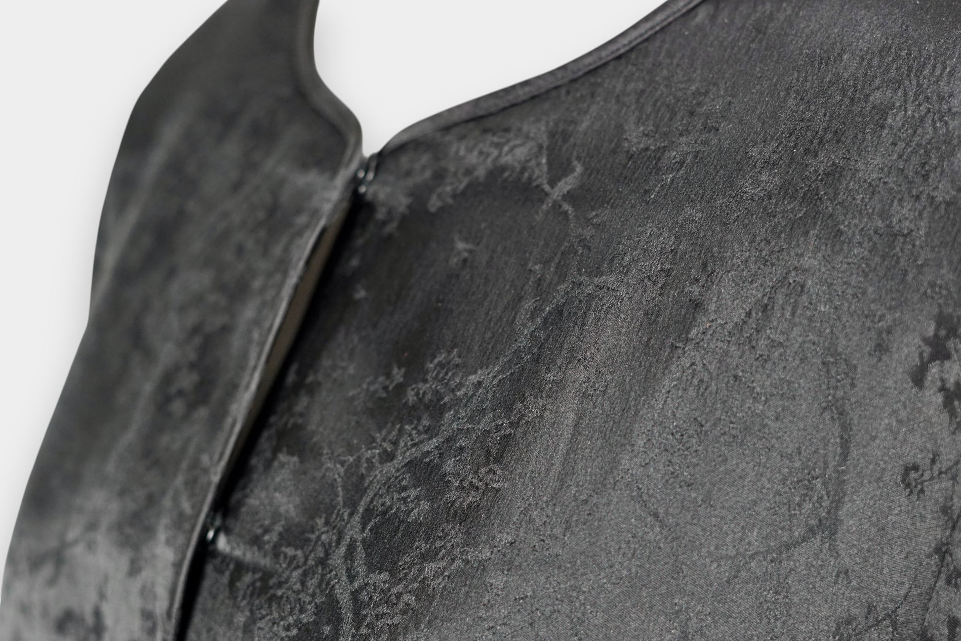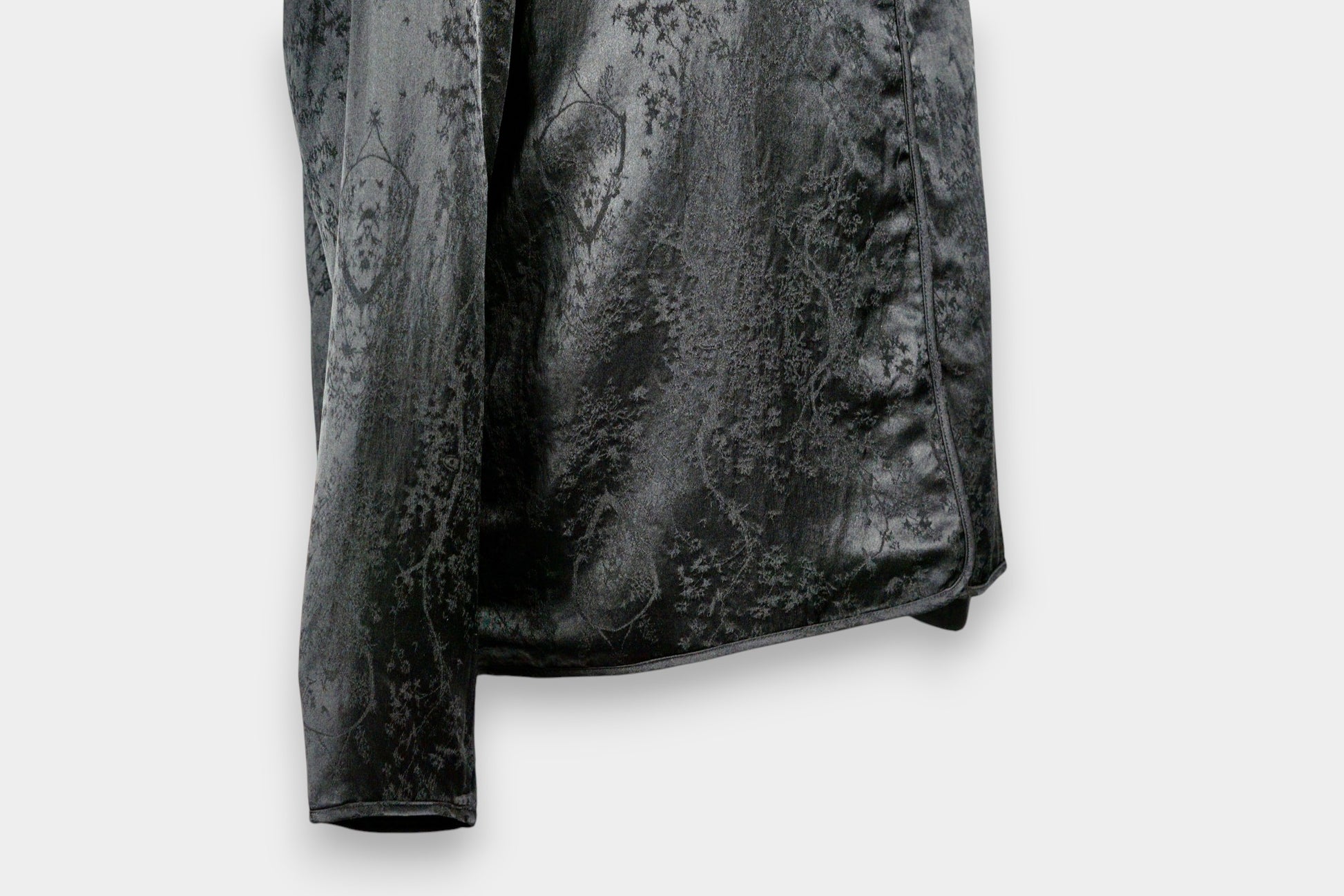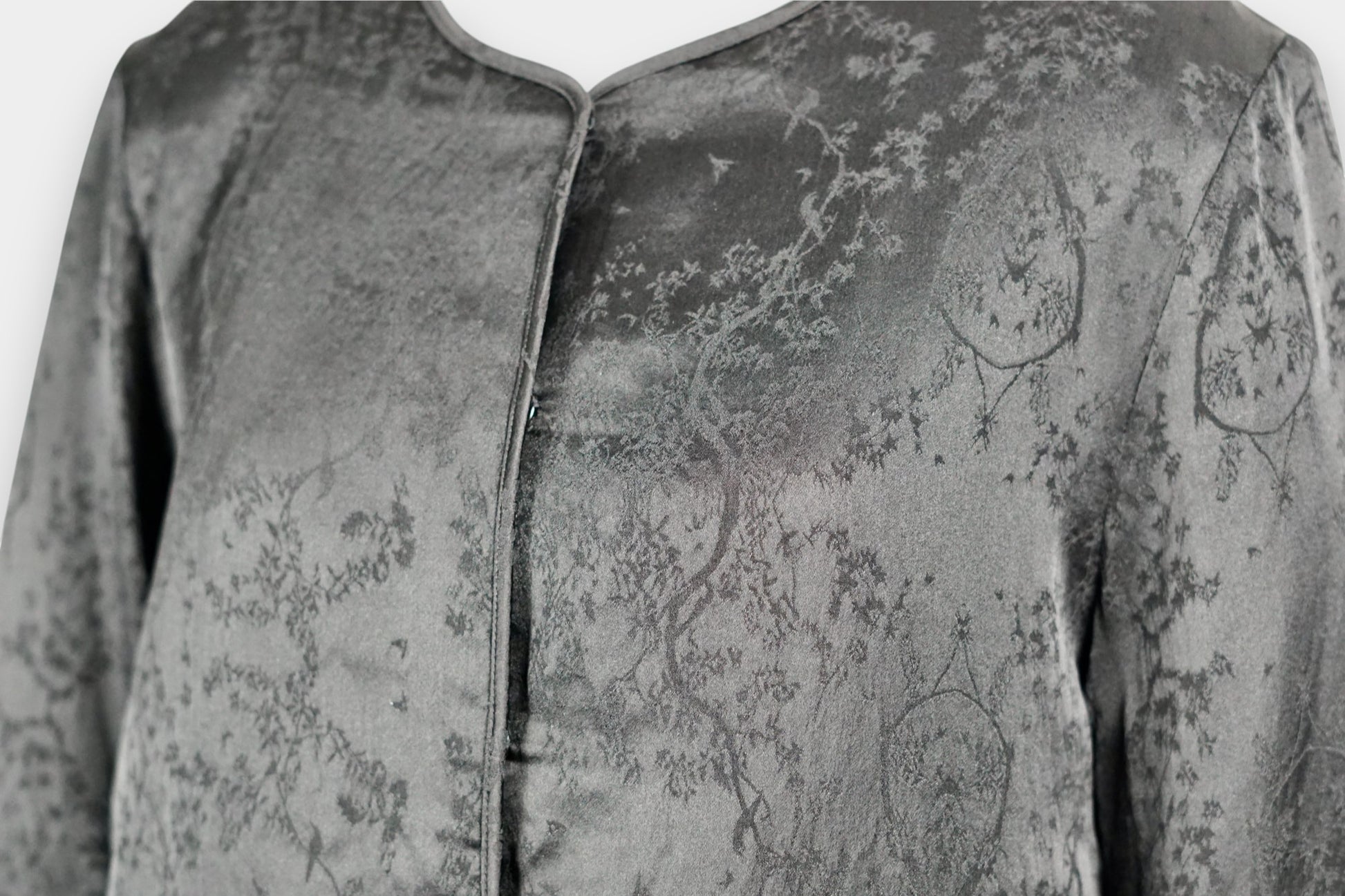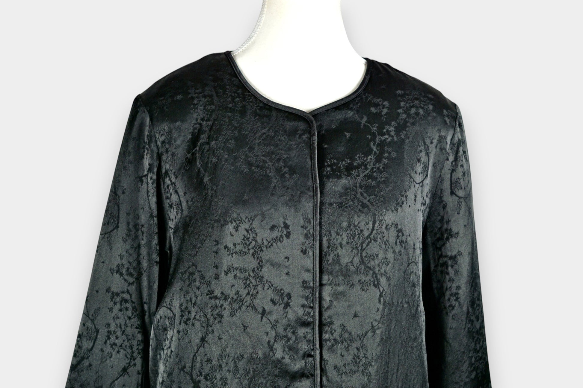Discover a wearable piece of art with our exquisite Handcrafted Black Mulberry Silk Jacquard Jacket. This modern outerwear piece is a testament to meticulous craftsmanship, blending the finest Mulberry silk with a unique jacquard weave. It is crafted from 100% pure Mulberry silk, ensuring a luxurious feel against your skin.