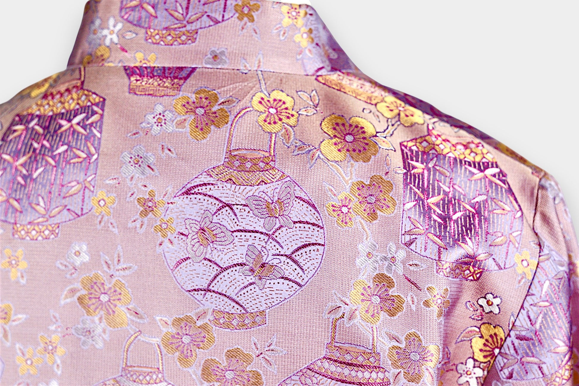 Each jacket is a testament to meticulous handcrafting, featuring a stunning floral brocade pattern that comes to life with a beautiful, iridescent sheen. The silk fabric’s unique quality means its colour and lustre subtly change under different lighting, making every moment an elegant display. The blouse is finished with delicate hand-tied Chinese knot buttons, subtle details from the artisanal heritage of its creation.
