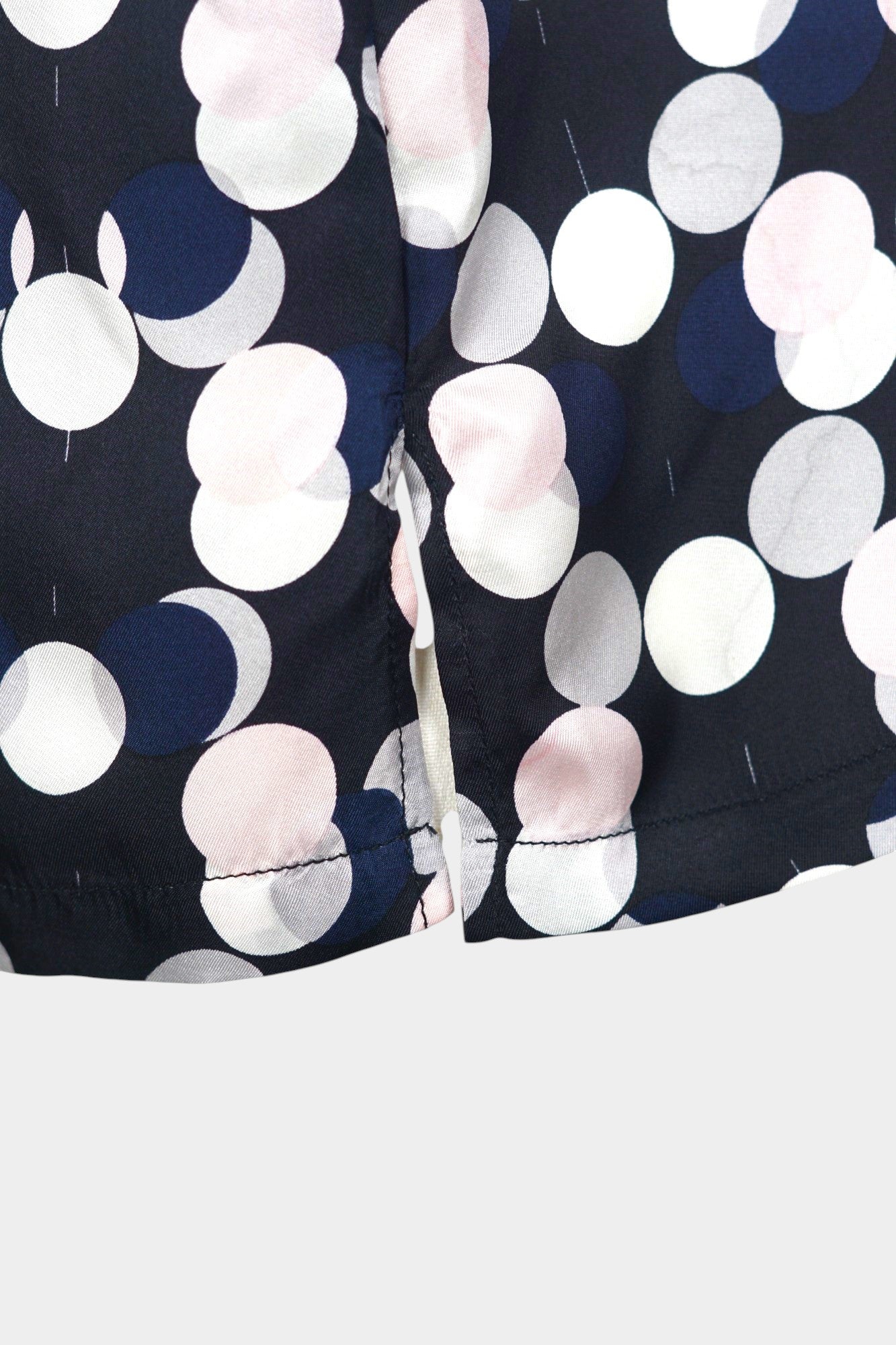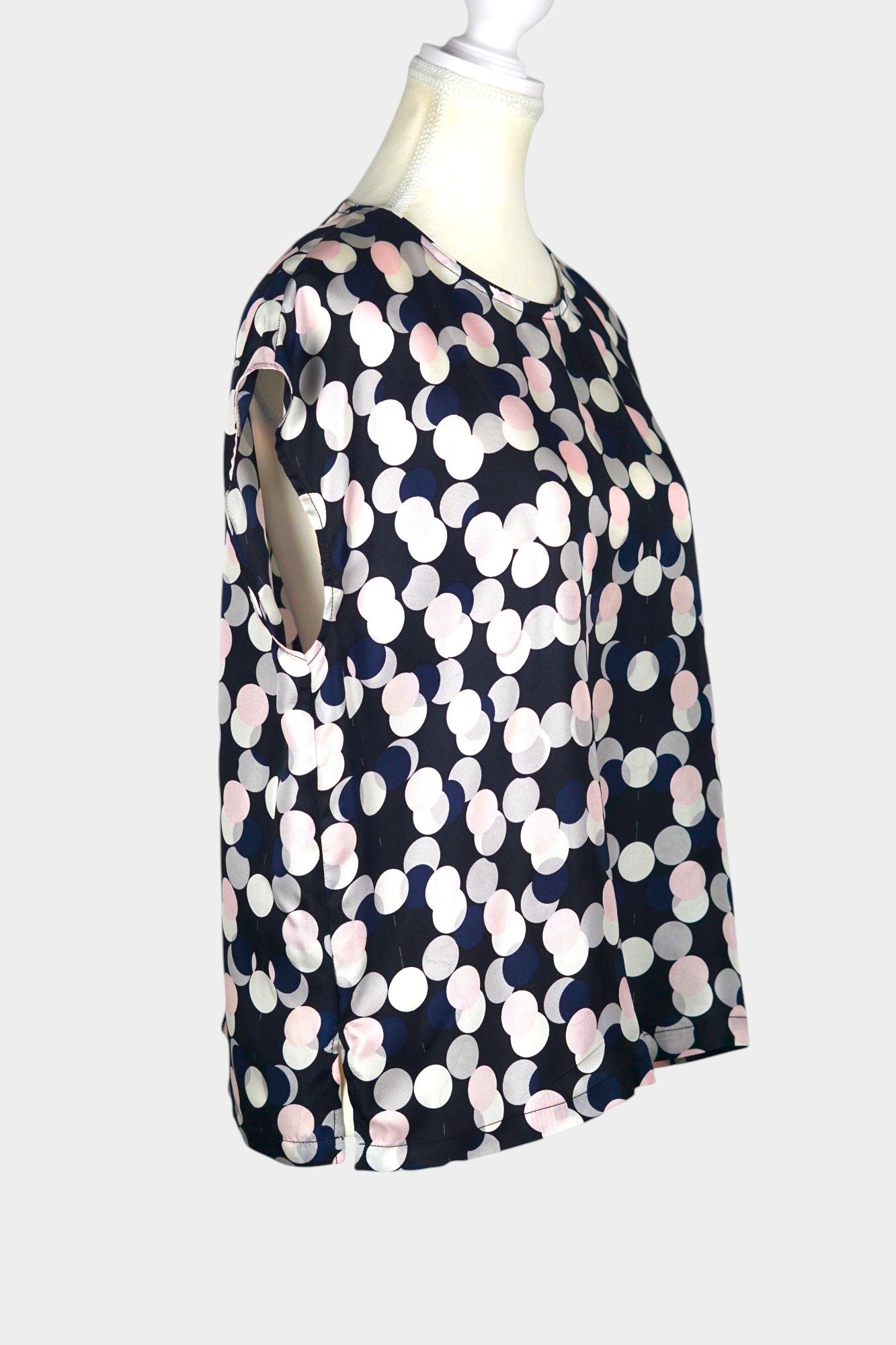 The top features a classic sleeveless cut with a relaxed silhouette, ensuring a comfortable fit. The striking multi-colour polka dot print combines shades of pink, white, and a deep navy, creating a dynamic and eye-catching pattern. It's a versatile piece that can be dressed up with tailored trousers for a polished office look or worn casually with shorts for a chic weekend outing.