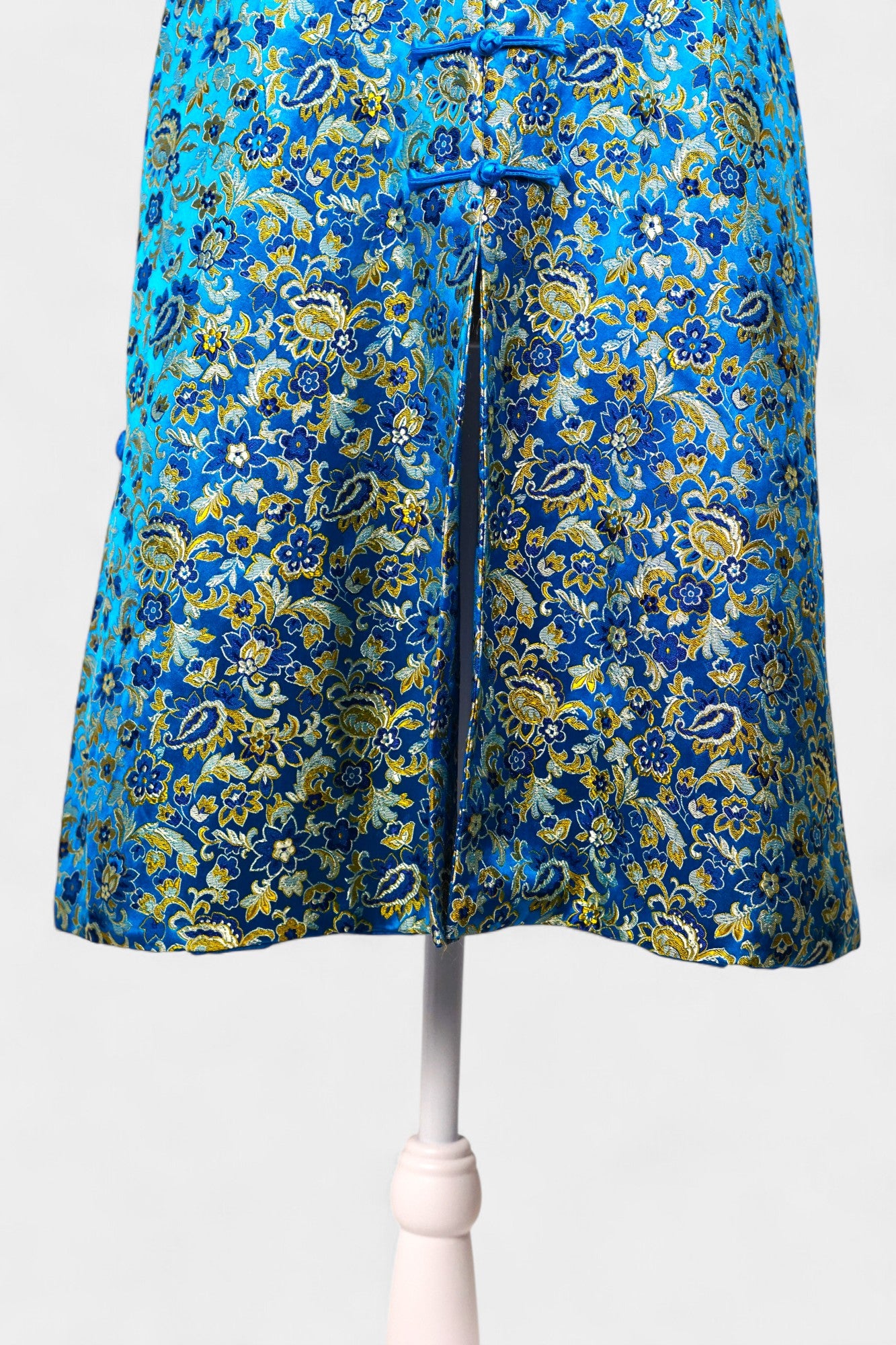 Step into a piece of history with this stunning Handmade Song Dynasty Brocade Silk Dress. Known as the "Treasure of Chinese Silk," Song Dynasty Brocade Silk is a luxurious fabric celebrated for its complex, intricate weaving techniques. This sleeveless dress is a testament to that artistry, featuring a vibrant blue base interwoven with a detailed gold and green floral jacquard pattern that catches the light beautifully.
