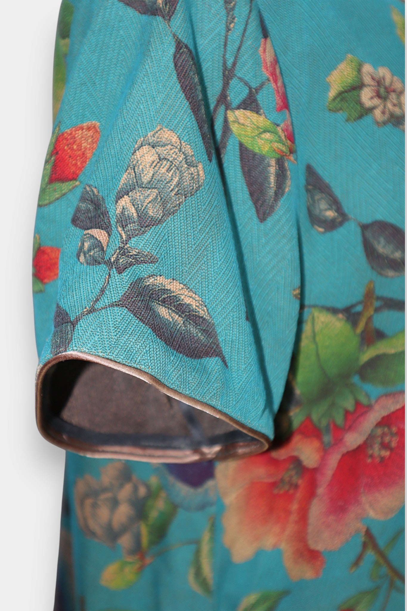 Teal blue base with botanical floral motifs in coral red, soft ivory, deep blue, and fresh green tones.