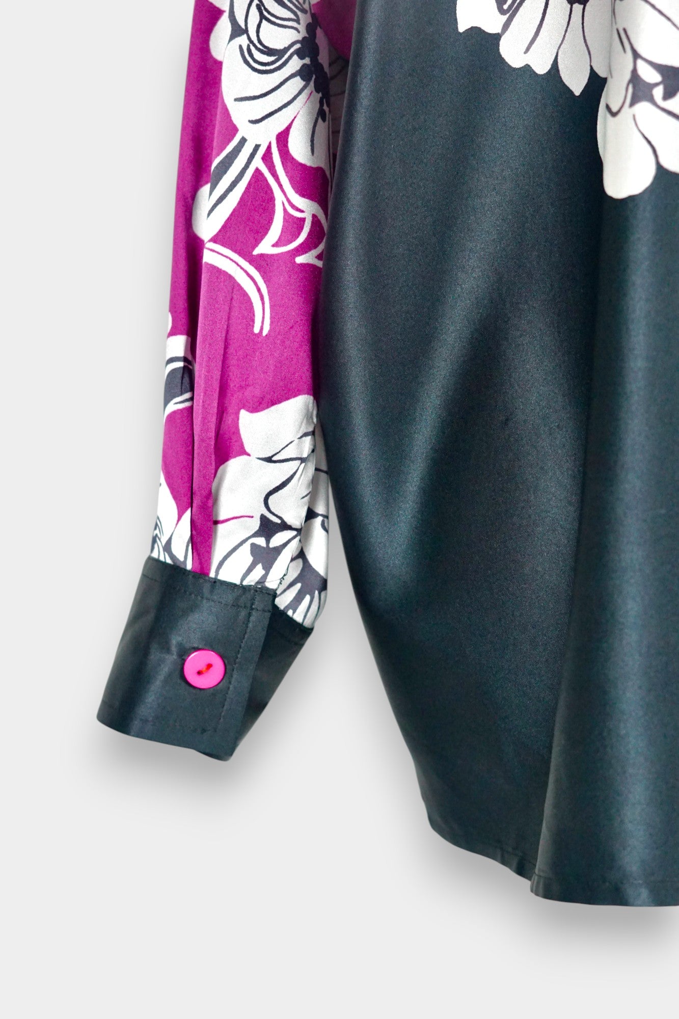 Make a bold artistic statement with our Handmade Mulberry Silk Shirt. This unique long-sleeve shirt is crafted from pure Mulberry Silk, offering a lightweight feel and a beautiful sheen that elevates its striking design. The top features a vibrant magenta and white floral print, seamlessly transitioning to a classic black on the bottom half in a modern colour-block style.