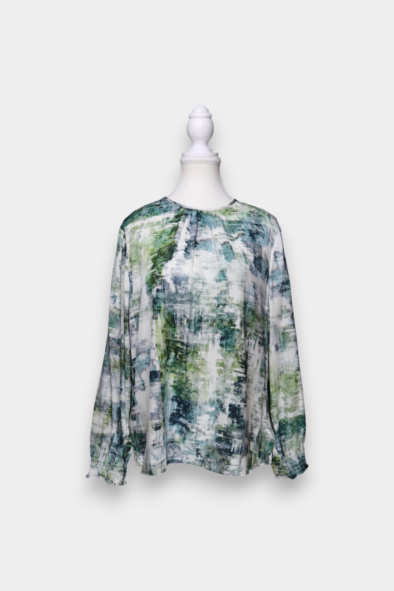 Blouse crafted from lightweight mulberry silk with a soft, fluid drape and an expressive abstract print. Designed with a relaxed, straight silhouette, it features a gently rounded neckline with subtle gathers and long sleeves finished with lightly elasticated cuffs.