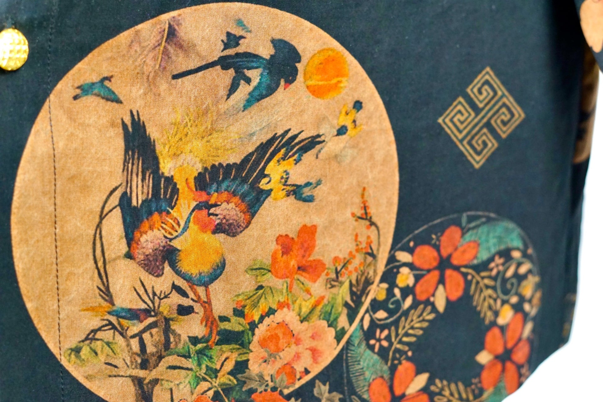 Design Details: The shirt showcases a stunning and detailed print that is rich in cultural symbolism. The two chest flap pockets add a practical and stylish detail. The bright, golden buttons provide a luxurious contrast against the dark background, highlighting the garment's exquisite craftsmanship.