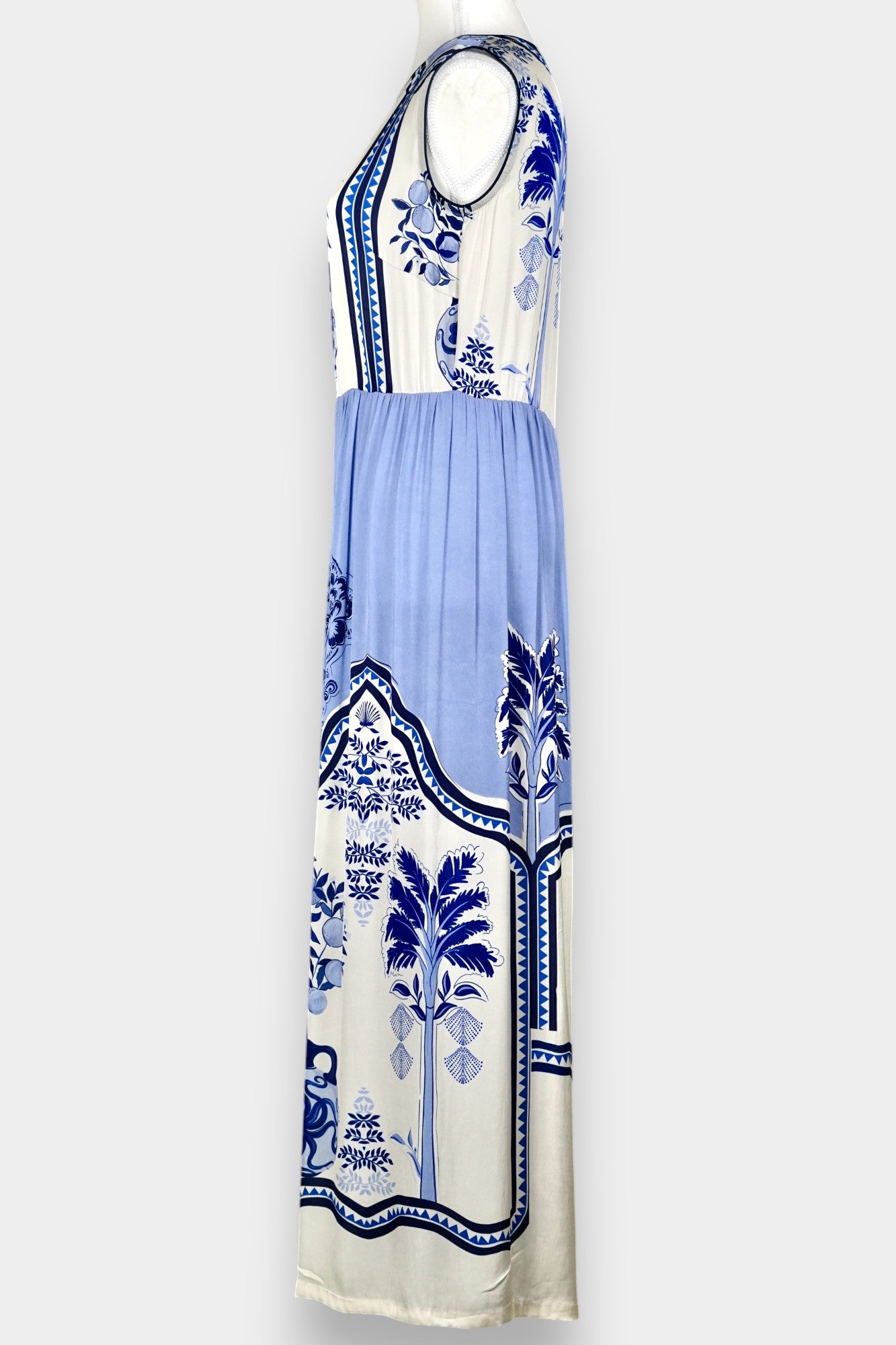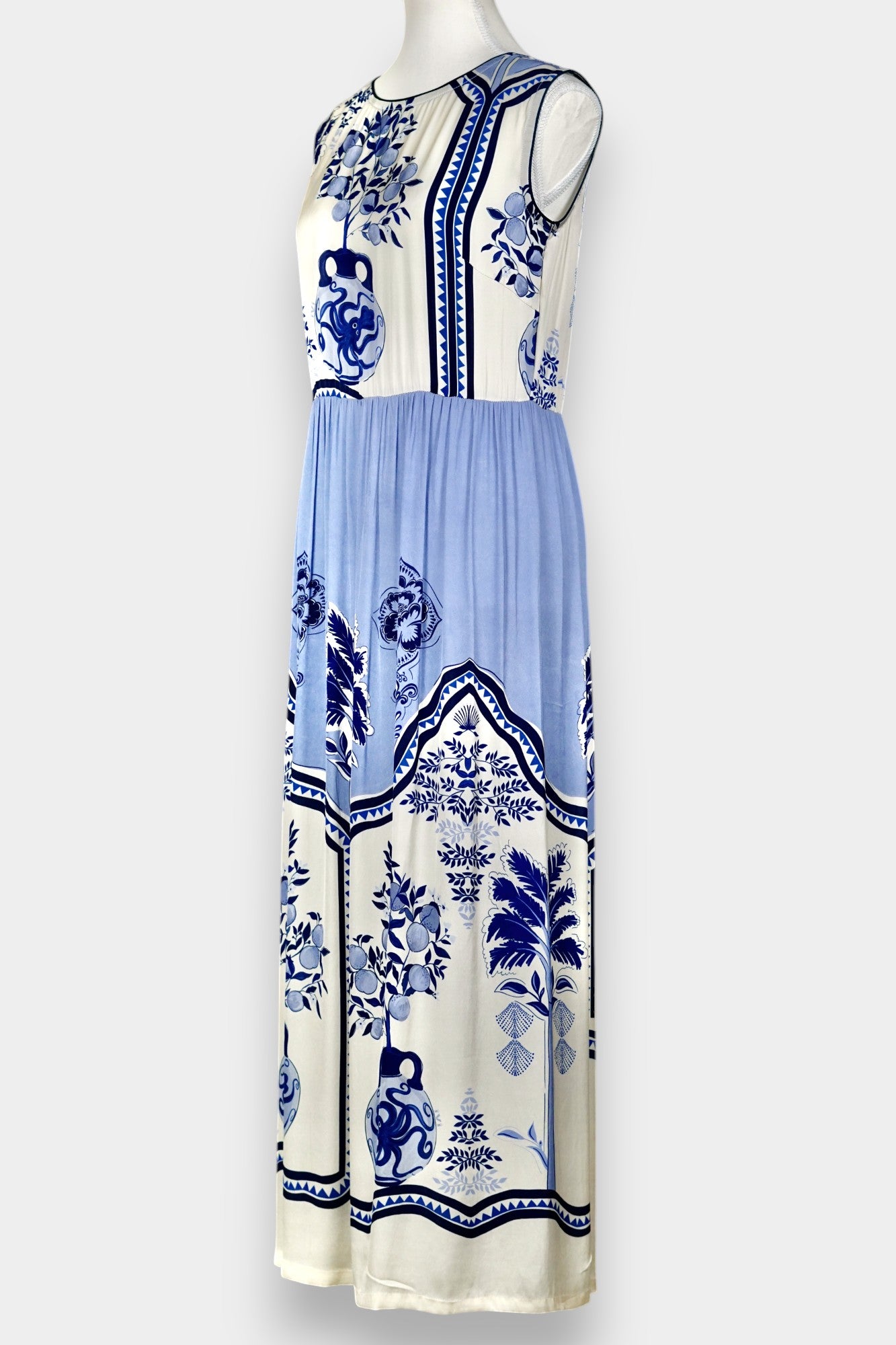 The dress features a timeless sleeveless design with a flattering A-line silhouette. Its true beauty lies in the detailed blue and white print, reminiscent of classic porcelain patterns. The artistic motifs, including ornate vases and delicate botanicals, create a sophisticated and eye-catching look. The subtly gathered waist adds a touch of definition, ensuring a graceful and elegant fit.