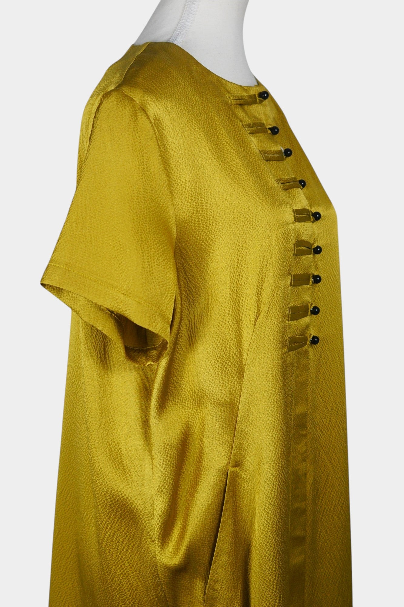 The design is both comfortable and elegant, featuring a relaxed, long-line silhouette with graceful short sleeves. The front is adorned with a series of traditional, hand-fastened frog knot buttons, a beautiful detail that adds a touch of authentic, bespoke charm. This dress is perfect for a special occasion or for elevating your everyday style.