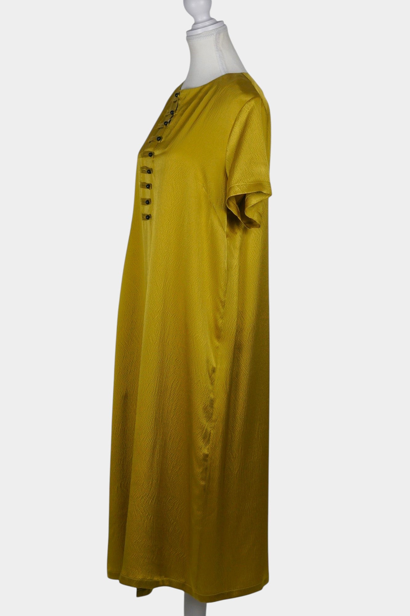 A Textured Touch of Gold: Crafted from 100% pure Mulberry Silk, this dress features a subtle jacquard weave, creating a delicate "pearl texture" pattern that catches the light beautifully. The radiant golden hue lends a warm, sophisticated glow that feels both timeless and modern. Each dress is handmade, reflecting a meticulous attention to detail and a commitment to genuine craftsmanship.