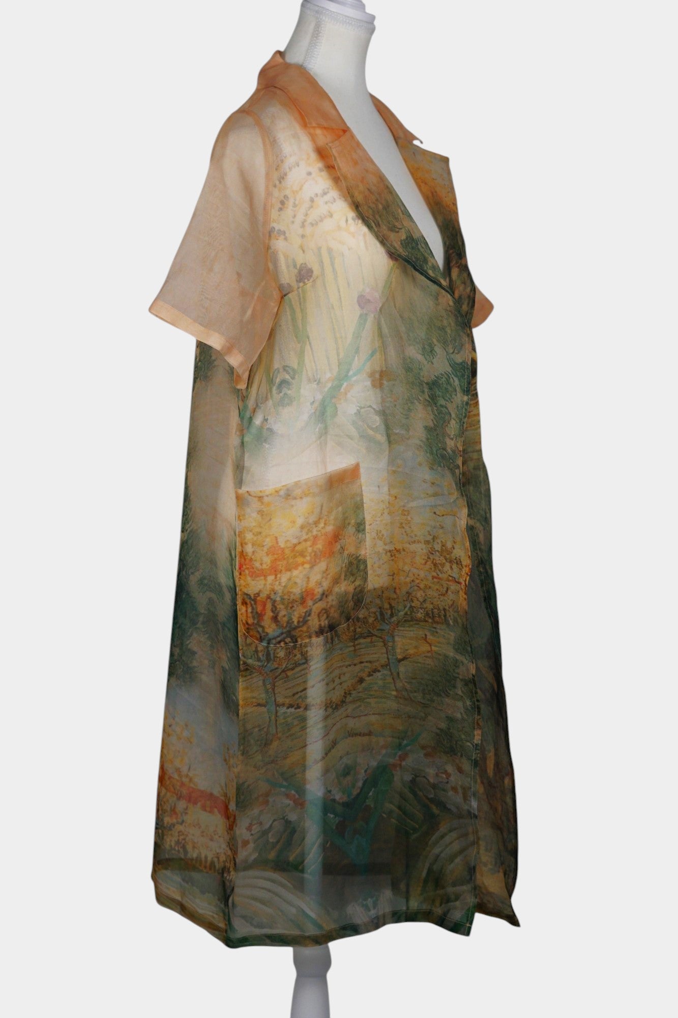 The jacket features a loose, flowing silhouette and a stylish lapel collar. Its standout feature is the beautiful, artistic print of a serene landscape, with soft, hand-painted colours and delicate details that create a captivating scene. The short sleeves and front pockets add both style and practicality to this elegant design.