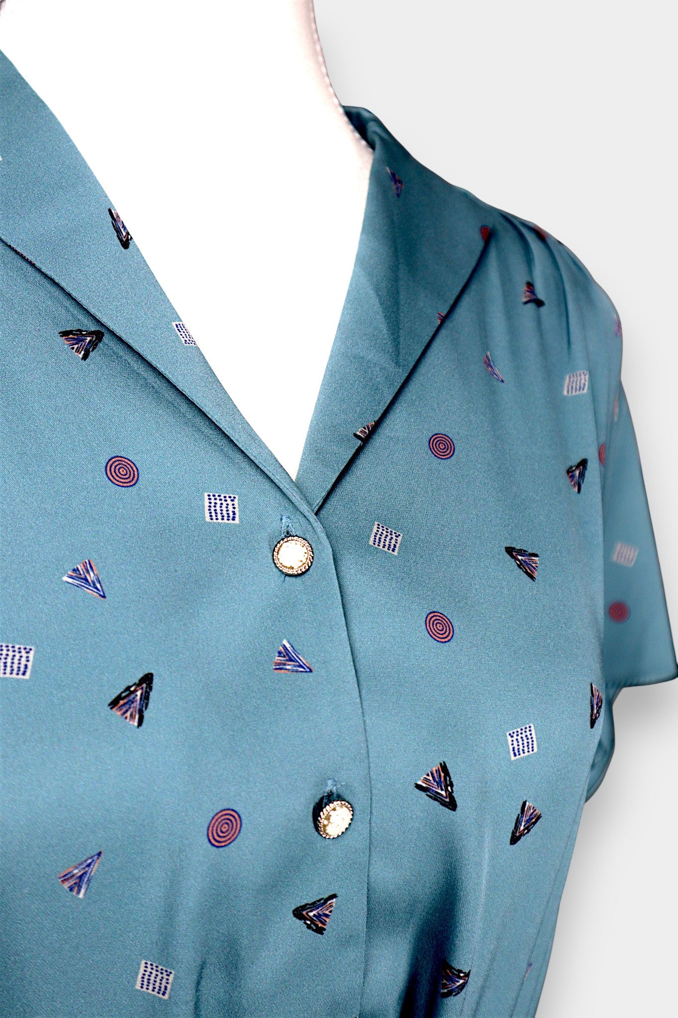 Dress crafted from lightweight mulberry silk with a soft, fluid drape and a relaxed, feminine silhouette. Features a gentle open-collar neckline, short sleeves, and a button-through front, finished with a self-tie waist for adjustable shaping.